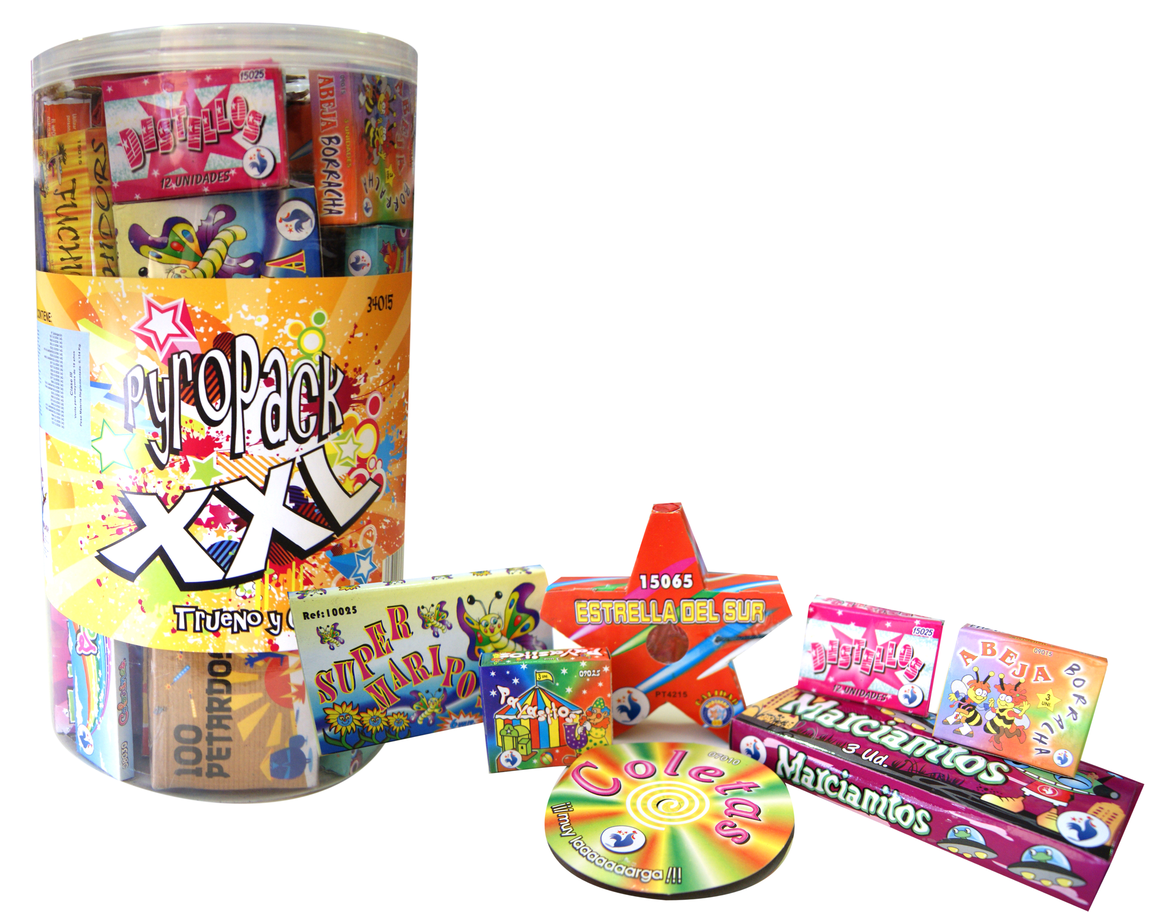 100 Petardos • Cobras • Súper Masclet 25u • Traca Boom • Coletas • Crackers Bomba • Canicas Espaciales • Chispitas 16 cm. • Bomberitos • Camelia Pequeña • Payasitos • Ciclón • Cíclope • Mini Fuente Cracker • Jarrón Chino • Súper V Mini • Fuente la Vendimia • Bolas de Humo • Paracaídas Multicolor • Volcán Mediano Colores Surtidos • Pyropops • Pistolas • Fuente Cuckoo • Colorines • Candela 5 Bolas • Tykari • Mecha de algodón.
